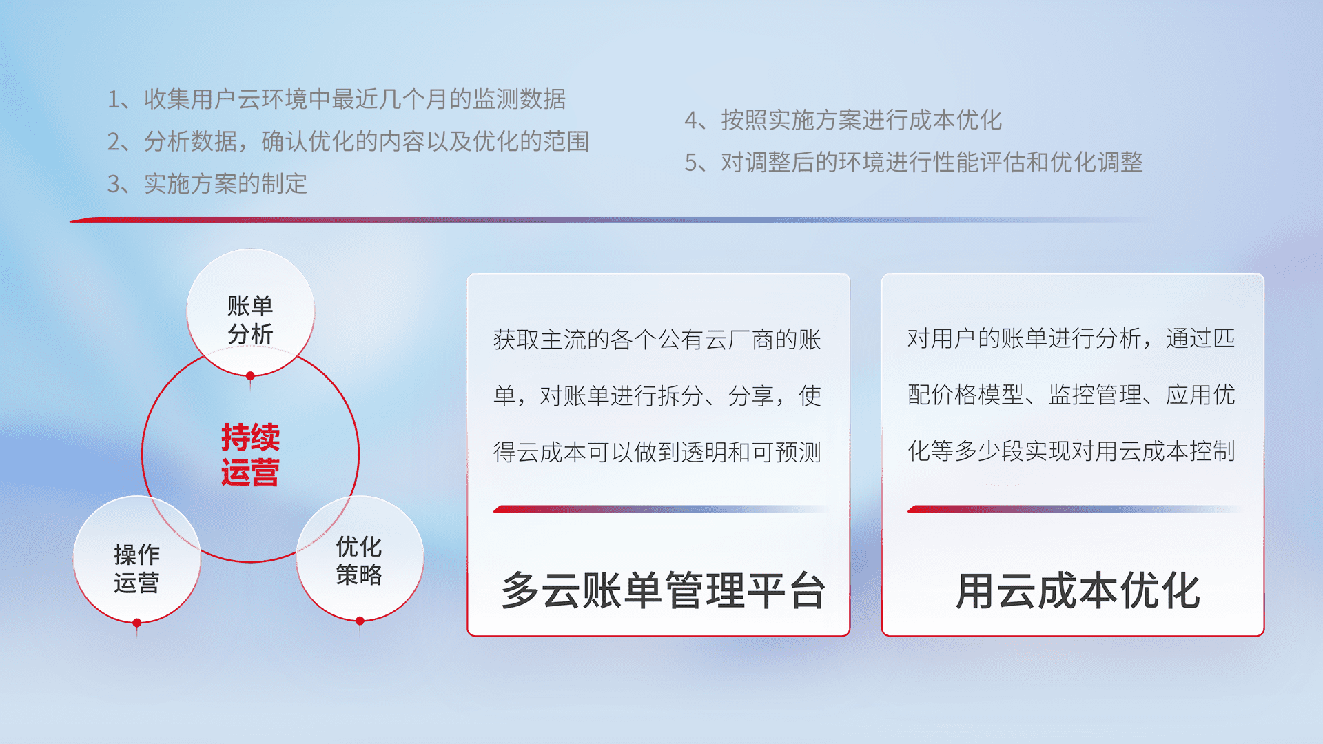通过多云纳管,,,,以统一的资源数据模型把客户的云资源进行抽象和封装,,进而实现对多云资源的统一操作,,,,保障云资源管理的可靠性、、、稳定性与可用性。。。量身定制化运维内容,,,配置、、、开发运维、、、补丁管理、、、备份、、监控、、认证和访问管理、、、审计和日常巡检等,,保障在用云过程中的可靠度,,,,稳定度以及高可用率。。。。